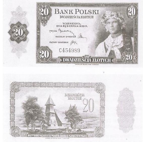 Francuscy artyÅ›ci przy projektowaniu wzorów banknotów mieli do dyspozycji jedynie wizerunki z polskich albumów. Przy projektowaniu dwóch banknotów o nominale 20 zÅ‚ posÅ‚użyli siÄ™ albumem „ÅšlÄ…sk” z serii albumów „Cuda Polski”. Banknoty nie zostaÅ‚y wydrukowane we Francji z powodu klÄ™sk wojennych. Projekt rozpoczÄ™to realizować w Anglii, a później, z powodu nadmiaru zamówieÅ„, realizacjÄ™ przeniesiono do Stanów Zjednoczonych. Wydrukowano tam jedynie dwa banknoty o zmienionych wzorach, lecz zachowanych motywach regionalnych. Banknot o nominale 20 zÅ‚ owiany byÅ‚ tematykÄ… Å›lÄ…ska. Na awersie biletu umieszczony zostaÅ‚ wizerunek dziewczyny w stroju weselnym, natomiast na rewersie znalazÅ‚ siÄ™ rysunek koÅ›cioÅ‚a z Leszczyn. Zaznaczyć należy fakt, że owy bilet byÅ‚ pierwszym polskim banknotem, w którym zastosowano w papierze fosforyzujÄ…ce konfetti majÄ…ce na celu zabezpieczenie przeciwko faÅ‚szerstwom.