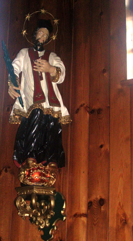 - W prezbiterium z prawej strony wisi drewniana figura św. Jana Nepomucena, pochodząca z Woszczyc; odnowiona w 2006r.