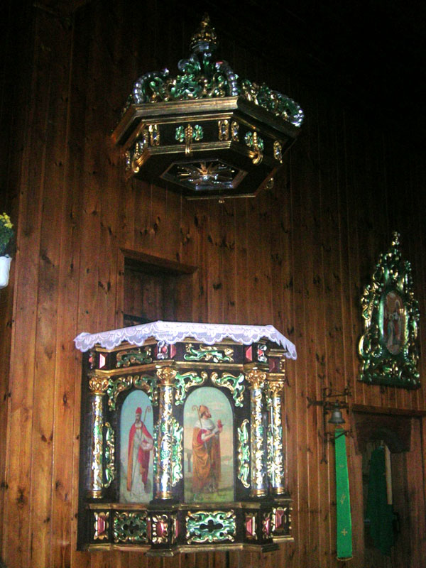 Ozdobna, rzeźbiona ambona z XVII w. z malowidÅ‚ami czterech „Ojców KoÅ›cioÅ‚a”. Po przeniesieniu koÅ›cioÅ‚a zostaÅ‚a odrestaurowana przez Alfreda BuchtÄ™ z dwóch trzecich pozostaÅ‚oÅ›ci oryginaÅ‚u. PonownÄ… renowacjÄ™ przeszÅ‚a w 2006r.