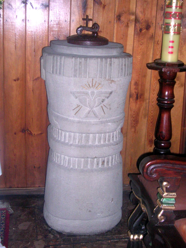 Chrzcielnica o miedzianej misie, nakrywana wiekiem, dopełniała podstawowego wystroju leszczyńskiej świątyni, jednak nie zdołano jej ocalić. Nową kamienną chrzcielnicę oraz kamienną kropielnicę wykonał Alfred Buchta.