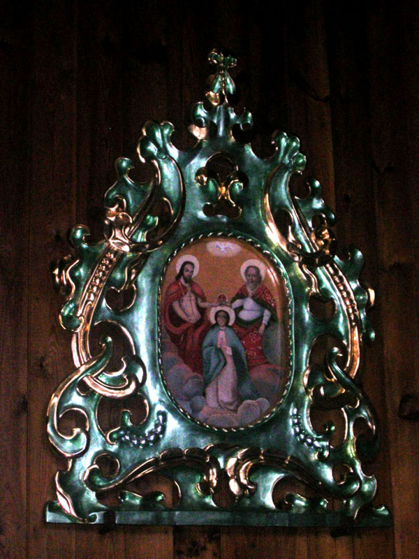 Wnętrze kościółka, kiedy jeszcze stał w Leszczynach, było niewielkie, ale właśnie dzięki tej "ciasnocie" kościółek był przytulny. Jego ściany były gęsto wyłożone obrazami. Sufit początkowo pomalowany był w motyw wici roślinnej, później jednak widniało na nim malowidło z wizerunkiem Trójcy Świętej w obłokach – repliki obrazu, znajdującego się w środkowej części ołtarza. Początkowo w kościele znajdowała się ceglana posadzka, jednak później zastąpiona została kamienną, z motywem liści winorośli. Chór wspierały krągłe, gładko ciosane słupy. W przedsionku stała ciężka, okuta skrzynia przeznaczona na sprzęt liturgiczny. Całość zamykały łukowate, nabijane ćwiekami drzwi oraz okna o drobnych szybach, zaokrąglone łukiem, wpuszczające zielonkawe, przesiane przez liście lip światło. Palowice: