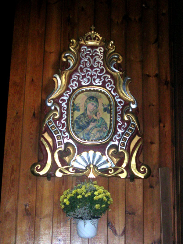 - duży obraz Matki Boskiej Różańcowej z Dzieciątkiem stojącym na jej kolanach