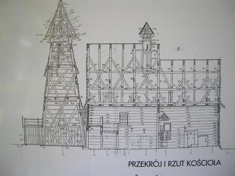 Na odkrytych fundamentach zrekonstruowano rzut przyziemia kościoła poprzez ułożenie dolnych belek podwalinowych w wieży, nawie głównej i prezbiterium. Mają one wymiary belek pierwotnego kościoła. W nawie głównej zachowano oryginalne partie posadzki z ciętego i łamanego piaskowca, zrekonstruowano podłogi drewniane pod dawnymi ławkami oraz podłogę wieży. W prezbiterium zachowano duży fragment oryginalnej posadzki ceramicznej. Układ posadzek jest zgodny z dawnymi zachowanymi poziomami ich posadowienia. Oprócz belek aranżację wzbogacają elementy architektoniczne - portale i kruchta odwzorowujące miejsca dawnych wejść do kościoła. Wykonane są wiernie według dawnych pierwowzorów. W nowej aranżacji w prezbiterium, miejscu usytuowania renesansowego ołtarza umieszczono misyjny kamienny krzyż Bożej Męki z 1887r. Całą ekspozycję kościoła obsypano tłuczniem po obrysie dawnych okalających go przydaszków. Całość wzbogacają pojedyncze zachowane kościelne głazy. Teren otoczenia kościoła zgodnie z dawną tradycją służył jako lokalny cmentarz.