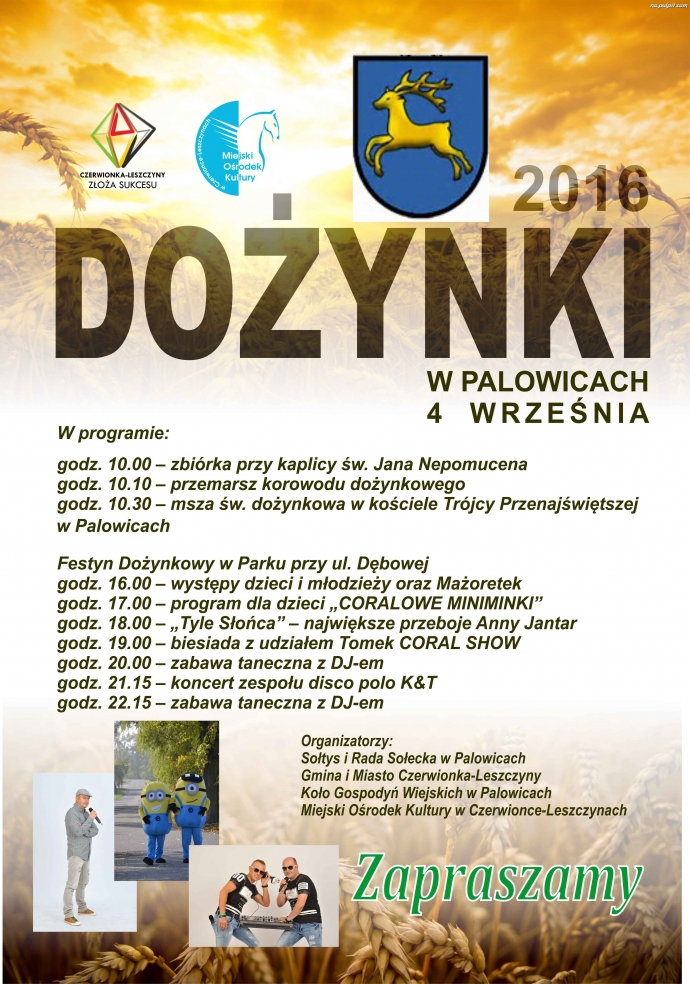 Sołtys, Rada Sołecka i Koło Gospodyń Wiejskich w Palowicach zapraszają wszystkich mieszkańców do udziału w tegorocznych dożynkach, które odbędą się 4 września. W programie m.in. biesiada z udziałem Tomek CORAL SHOW, Koncert zespołu disco-polo K&T, gry i zabawy dla dzieci oraz zabawa taneczna. Serdecznie zapraszamy.Program: